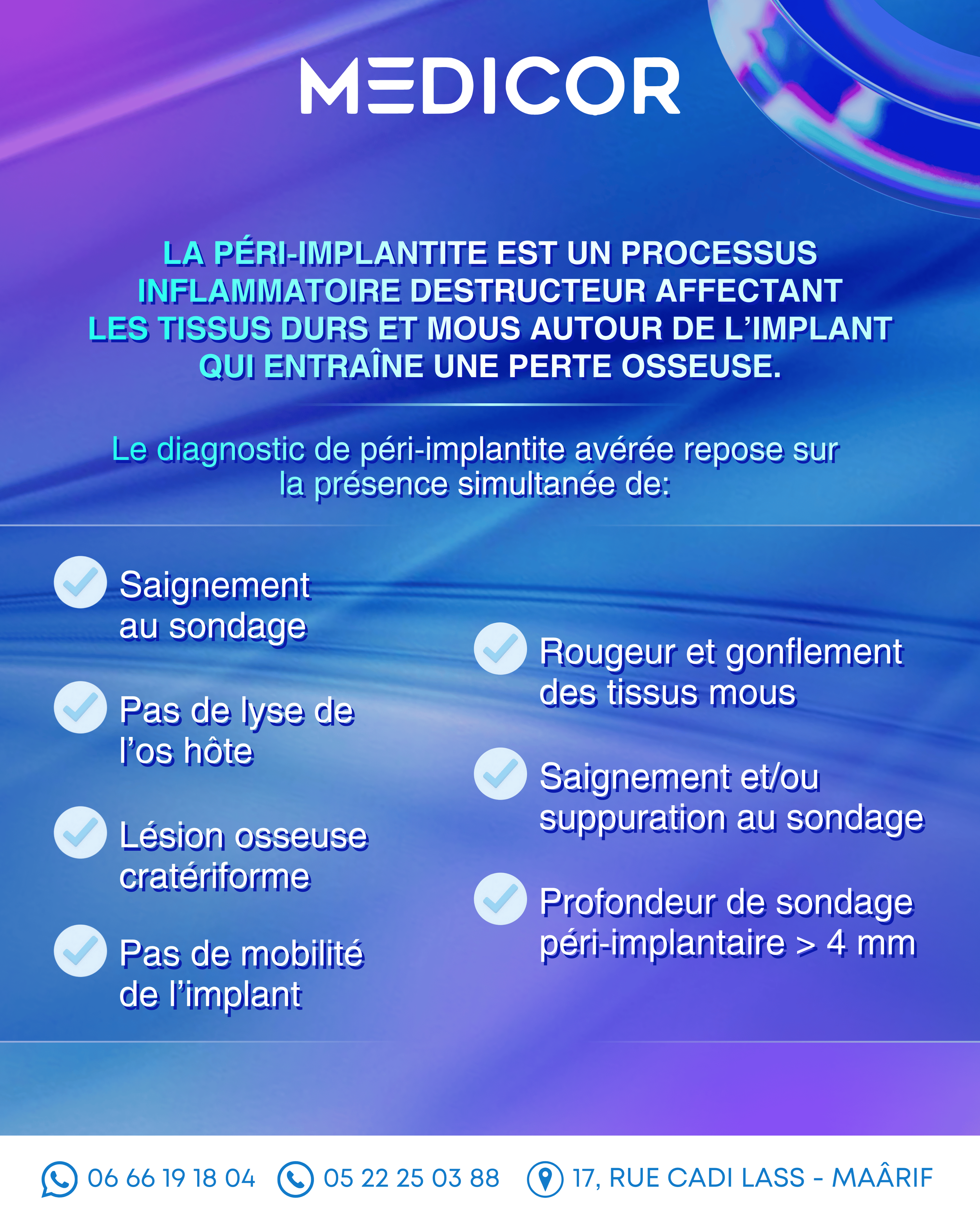 Le diagnostic de péri-implantite repose sur plusieurs critères :
