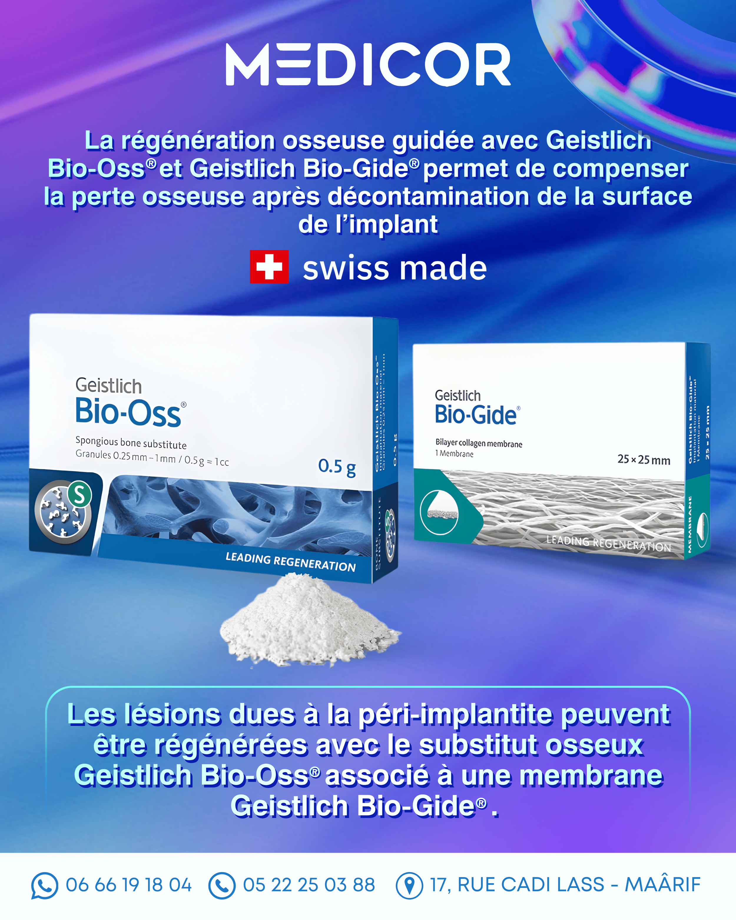 Après une décontamination de la surface implantaire, la régénération osseuse guidée (ROG) avec Geistlich Bio-Oss® associée à la membrane Geistlich Bio-Gide® permet :