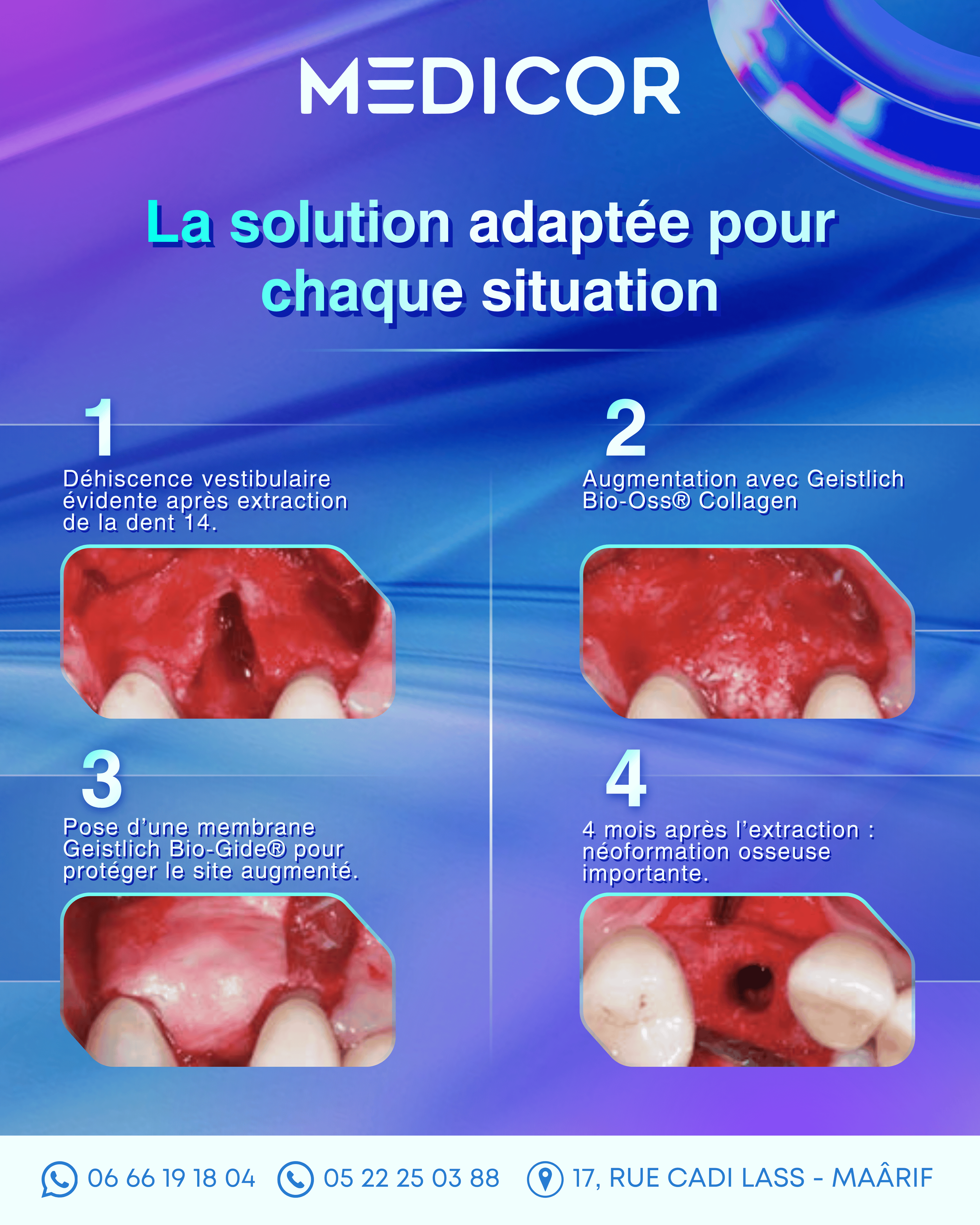 La régénération osseuse guidée est un enjeu majeur en implantologie et chirurgie orale, notamment lorsque l’on fait face à des déficits alvéolaires après extraction. Geistlich Bio-Oss®, associé à la membrane Geistlich Bio-Gide®, offre des solutions fiables et prévisibles pour préserver le volume osseux et favoriser la cicatrisation.